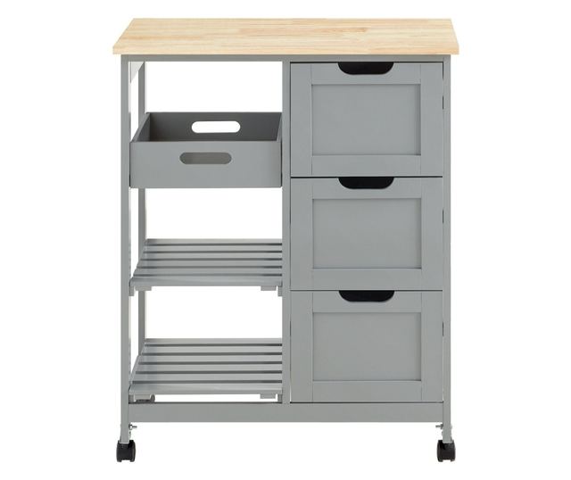 Če vas še vedno skrbi pomanjkanje prostora, je ta preprost in eleganten kos pohištva prava stvar za vas! Komoda se s svojimi majhnimi dimenzijami odlično prilega tako v restavracijah kot v kuhinji. S 3 praktičnimi predali, košaro in dvema policama vam voziček nudi veliko dodatnega prostora za vaše kuhinjske dodatke. Košara je opremljena z vodili, tako da jo je mogoče tudi enostavno odstraniti. Lesena plošča je idealna za kuhinjo, saj ščiti voziček pred vodo, oksidacijo in korozijo. Štiri 360° vrtljiva kolesa vam omogočajo prosto premikanje vozička brez praskanja po tleh. Dve kolesci, opremljeni z zavorami, se lahko zakleneta, da postavite voziček v stabilen položaj. Podrobnosti o izdelku: Material: MDF, akrilni lak - Dimenzije izdelka: D67*D37*V84 cm (glej sliko). - Teža: 17 kg. Nosilnost do 50 kg. - Mere in teža paketa: 88,00*45,00*23,00 cm, 16,4 kg - Z navodili za montažo in vijaki, enostavna namestitev - Ta izdelek je bil razvit in testiran za domačo uporabo.