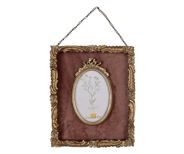 Material: Poliresin / Žamet / Steklo. Dimenzije okvirja: Dolžina 23 cm x Širina 3 cm x Višina 28 cm. Dimenzije fotografije: Dolžina 10 cm x Višina 15 cm. Barva: Zlata / Bordo. Slog: Klasičen. Kategorija: Dekoracija doma
