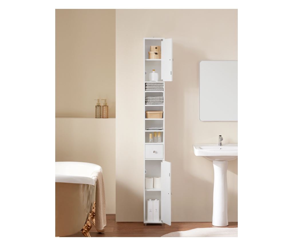 Zaradi bele barve v visokem sijaju je ta visoka omarica v kopalnici nekaj posebnega.