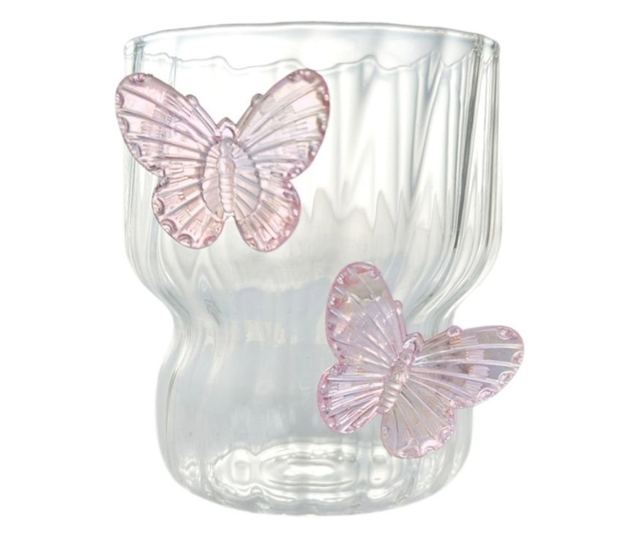 Steklen kozarec iz borosilikatnega stekla, valovite stene, roza metulji, 260 ml, eCarla, SZK161