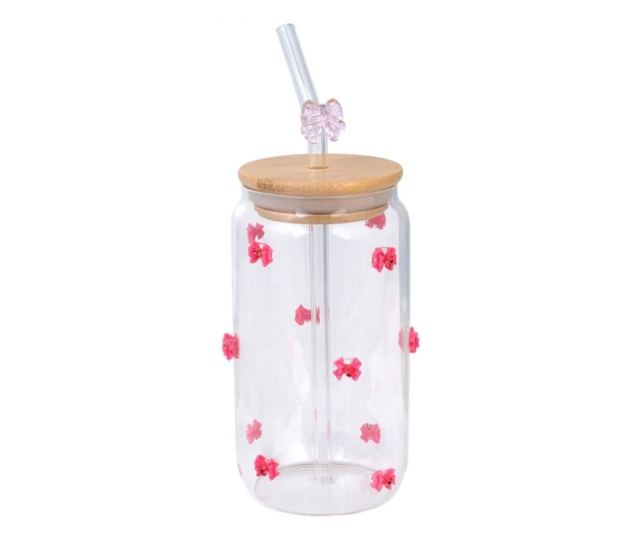 Steklen kozarec z bambusovim pokrovom, slamico in pentljami, 460 ml, eCarla, SZK135