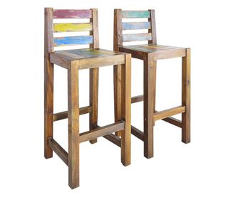 Barski stoli so izdelani iz masivnega predelanega lesa, pridobljenega iz starih ribiških čolnov, in so lahko sestavljeni iz različnih vrst lesa, kot so mindi (beli cedra), akacija, hibiskus itd. To pomeni, da predelan les ohranja značilnosti teh različnih vrst lesa. Predelan les je že staran in posušen, zato se ne bo skrčil ali upognil. Znaki obrabe, vidna struktura lesa in stara plast barve dajejo kompletu svojo zgodovino in edinstven videz. Vsak korak proizvodnega procesa se izvaja z največjo skrbnostjo, bodisi poliranje, barvanje ali lakiranje. Barski stoli so enostavni za sestavo. Dostava vključuje 2 barska stola.