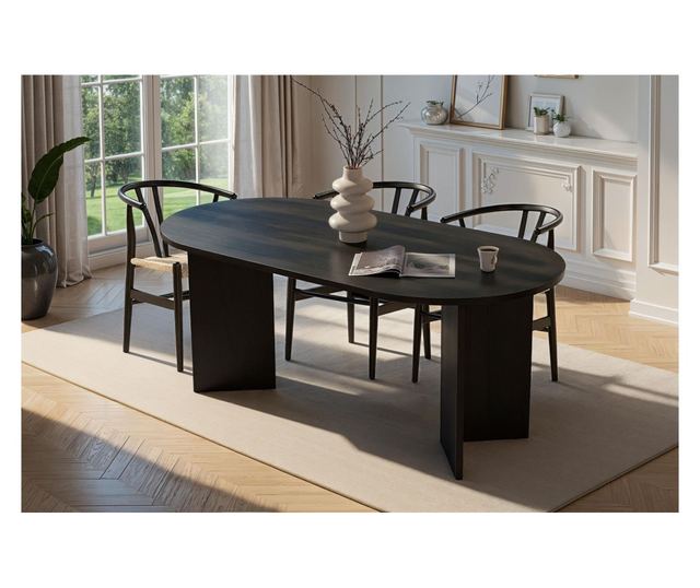 S to osupljivo jedilno mizo spremenite svojo jedilnico v eleganten in prefinjen prostor. Izdelana iz 100% iverne plošče, prevlečene z melaminom, je ta miza ne le vzdržljiva, ampak tudi izžareva eleganco in čar. Elegantna barva lesa črne barve doda pridih modernosti vsakemu jedilnemu prostoru, zaradi česar je popoln osrednji kos za družinska srečanja in večerje.