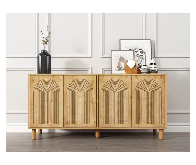 Z dimenzijami 150 cm širine, 73 cm višine in 36 cm globine je ta omarica popolne velikosti, da ustvari osrednjo točko v vašem prostoru. Višina nog 13 cm doda pridih prefinjenosti in omogoča enostavno čiščenje pod njo.