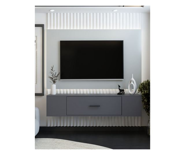 Antracit barva tega TV regala doda pridih modernosti vsakemu prostoru. Ne glede na to, ali je vaš stil dekoracije minimalističen ali eklektičen, se bo ta regal neopazno zlil in izboljšal celotno estetiko vašega prostora. Za dodatno stabilnost in varnost ga je mogoče tudi pritrditi na steno.