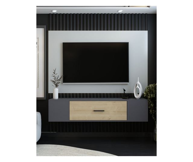 S tem čudovitim TV regalom spremenite svoj dnevni prostor, izdelan iz 100% iverne plošče, prevlečene z melaminom, za vzdržljivost in slog. Elegantna zasnova in sodobni barvi antracita in safirnega hrasta bosta popestrili vsak prostor in ustvarili osrednjo točko za vaše zabave.