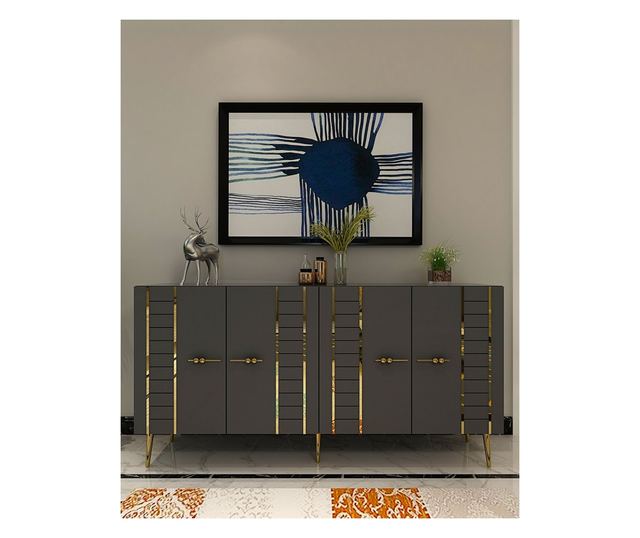 S to osupljivo konzolo v barvi antracita in zlata preoblikujte svoj bivalni prostor. Ta kos pohištva ni le kos pohištva, ampak izjava elegance in prefinjenosti. Elegantna zasnova in sodobna barvna kombinacija bosta takoj popestrili vzdušje vsake sobe in jo naredili osrednjo točko vašega doma.