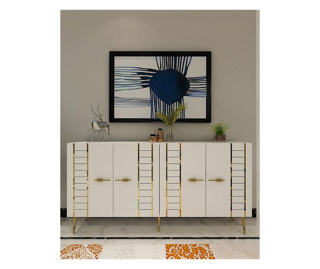 S to čudovito konzolo, izdelano iz 100 % iverne plošče, prevlečene z melaminom, preoblikujte svoj bivalni prostor. Elegantna oblika in kombinacija bele in zlate barve bosta takoj popestrili videz vsake sobe.