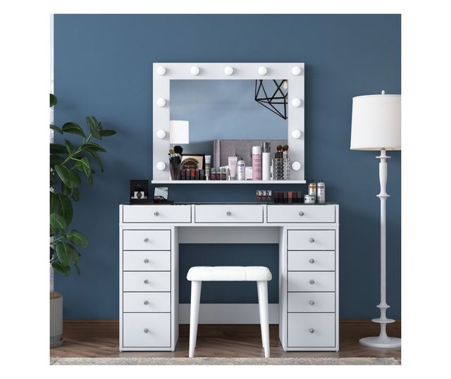 Z elegantno belo barvo in modernim dizajnom bo ta toaletna mizica popestrila videz vsake sobe. Veliko prostora za shranjevanje in številne police nudijo dovolj prostora za vse vaše lepotne pripomočke, tako da bo vaš prostor urejen in brez nereda. Priložen tabure doda pridih razkošja, zaradi česar se bo vaša lepotna rutina vsak dan počutila kot razvajanje.